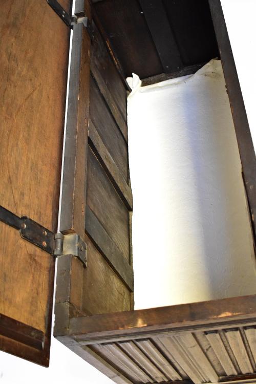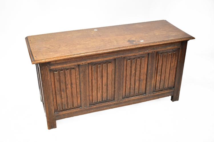 Lot 56 of 1095: An early 20th century oak blanket box with hinged lid above four panels to the front and two panels to each side, all with linen fold decoration, raised on stile supports, 64 x 132 x 48cm.