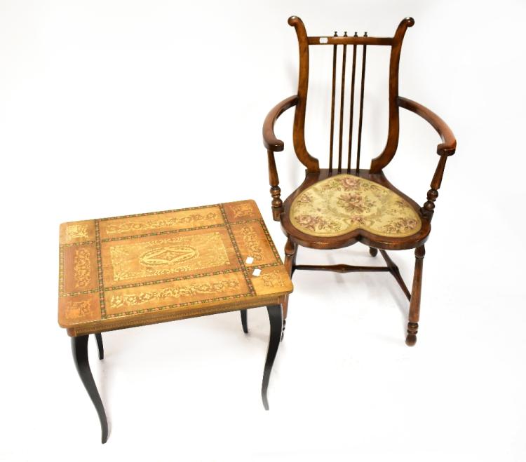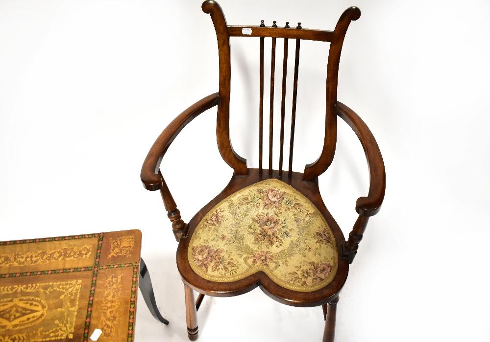 Lot 62 of 1095: An Edwardian walnut open arm elbow side chair, with lyre-shaped back and heart-shaped upholstered seat, raised on turned stretchered supports, also an inlaid musical table with hinged lid to slender cabriole supports (2).