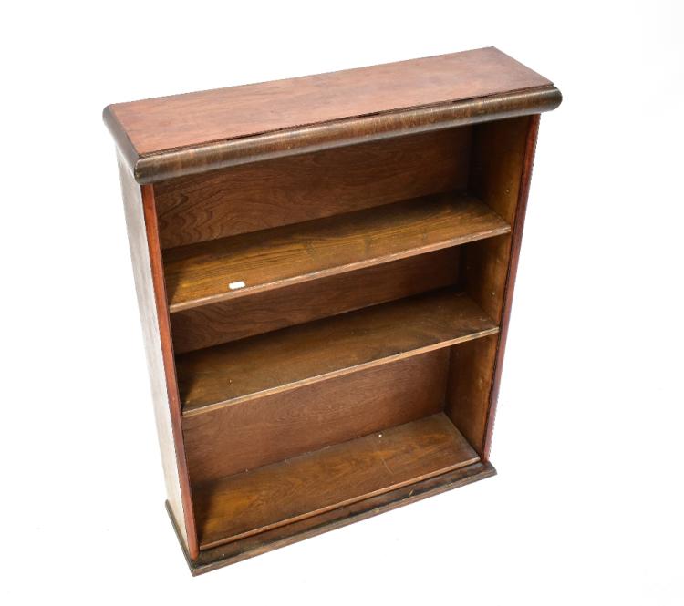 Lot 65 of 1095: A mid-20th century oak floorstanding bookcase of three shelves, with cushion cornice, 91 x 72 x 21.5cm.