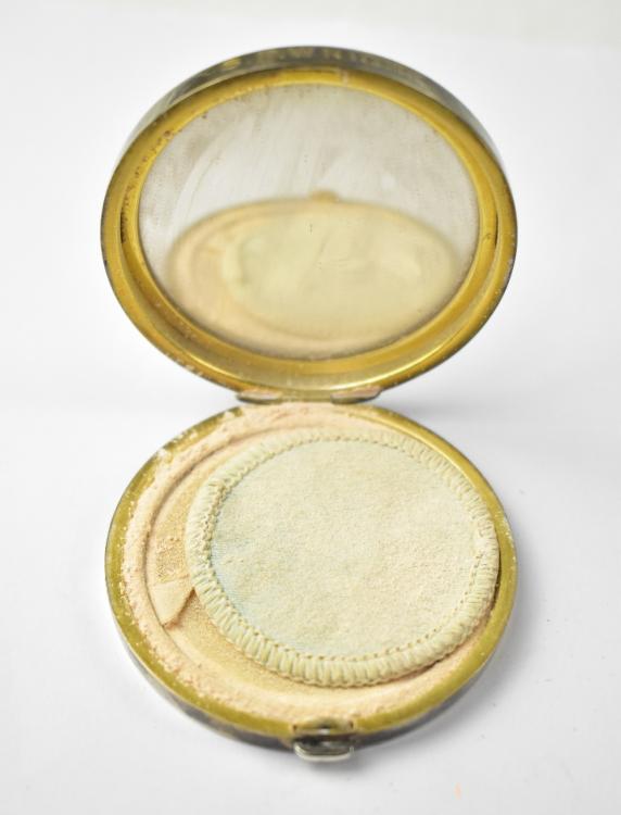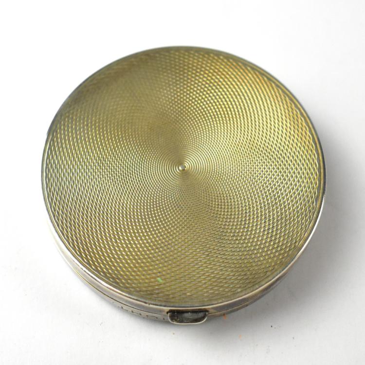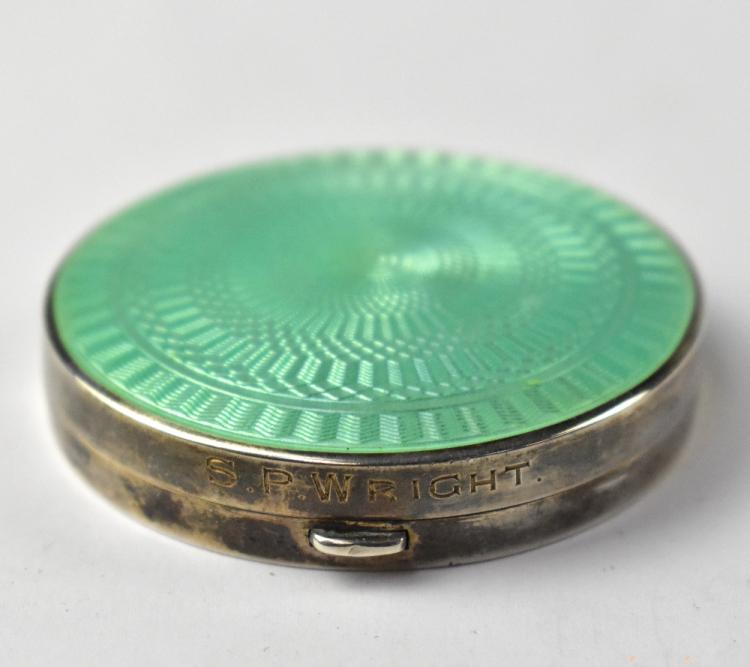 Lot 228 of 1095: A circa 1930s white metal and turquoise guilloché compact, engraved to the front 'S.P.Wright', with original powder.