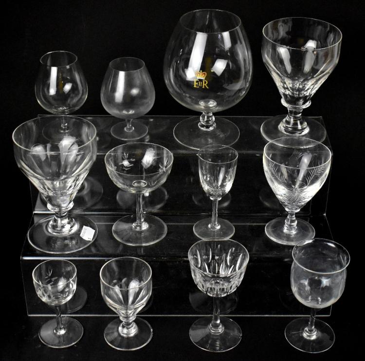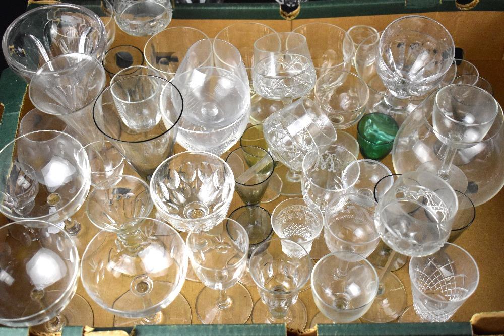 Lot 364 of 1095: Various drinking glasses, mainly 20th century, to include some etched examples and cut glasses including Champagne balloons, liqueur examples, wine glasses, brandy balloons, coloured glasses, etc.