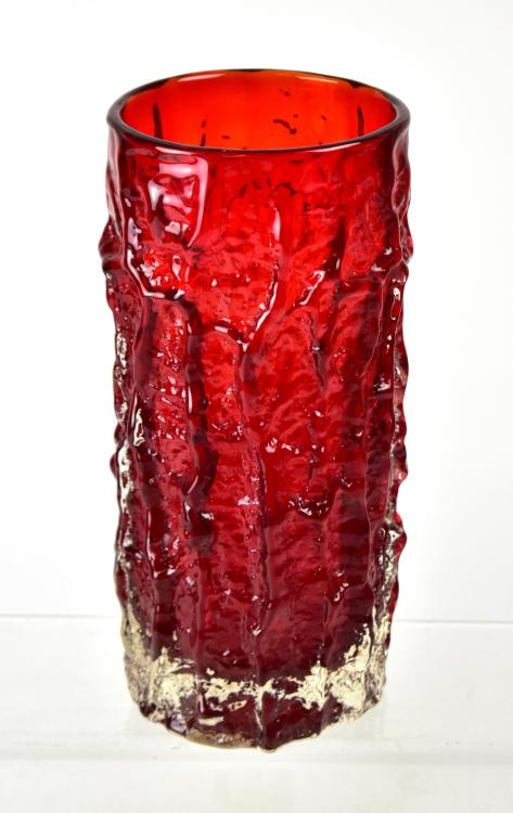 Lot 367 of 1095: WHITEFRIARS; a Geoffrey Baxter large cylindrical textured bark effect vase in red, with polished pontil base, height 23.5cm, diameter 10cm.