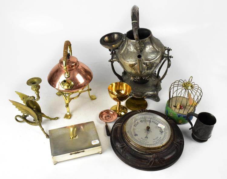 Lot 392 of 1095: A quantity of collectible items, mainly metalware to include a copper kettle on a decorative brass tripod stand, a silver plated spirit kettle on stand, a silver plated cigarette box, a modern Japanese musical model of a bird in a cage, an oak-cased barometer and other items.