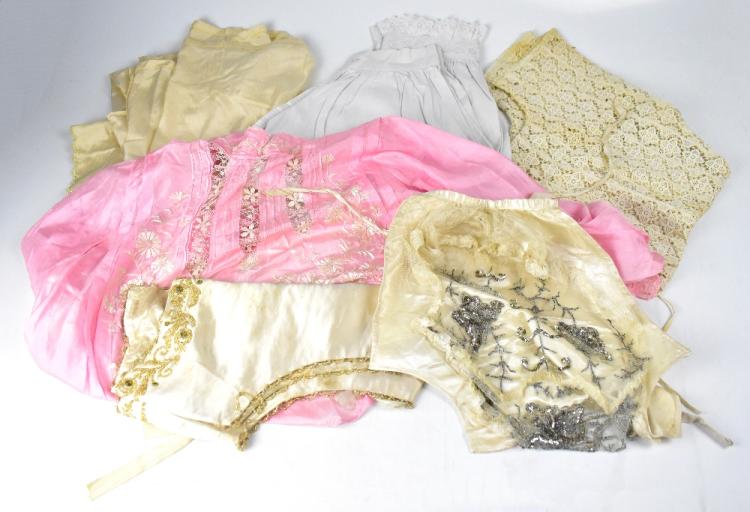 Lot 553 of 1095: A collection of vintage clothing and textiles to include a cream satin bib overlaid with beaded and sequinned mesh panel, a lacework short-sleeved top, a pink sateen blouse with cream embroidery of flowers and a bow with vertical cut panels, a cream satin beaded bolero with gold-coloured floral borders, a pair of bloomers with lace trim and a cream silk underdress.