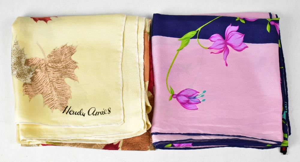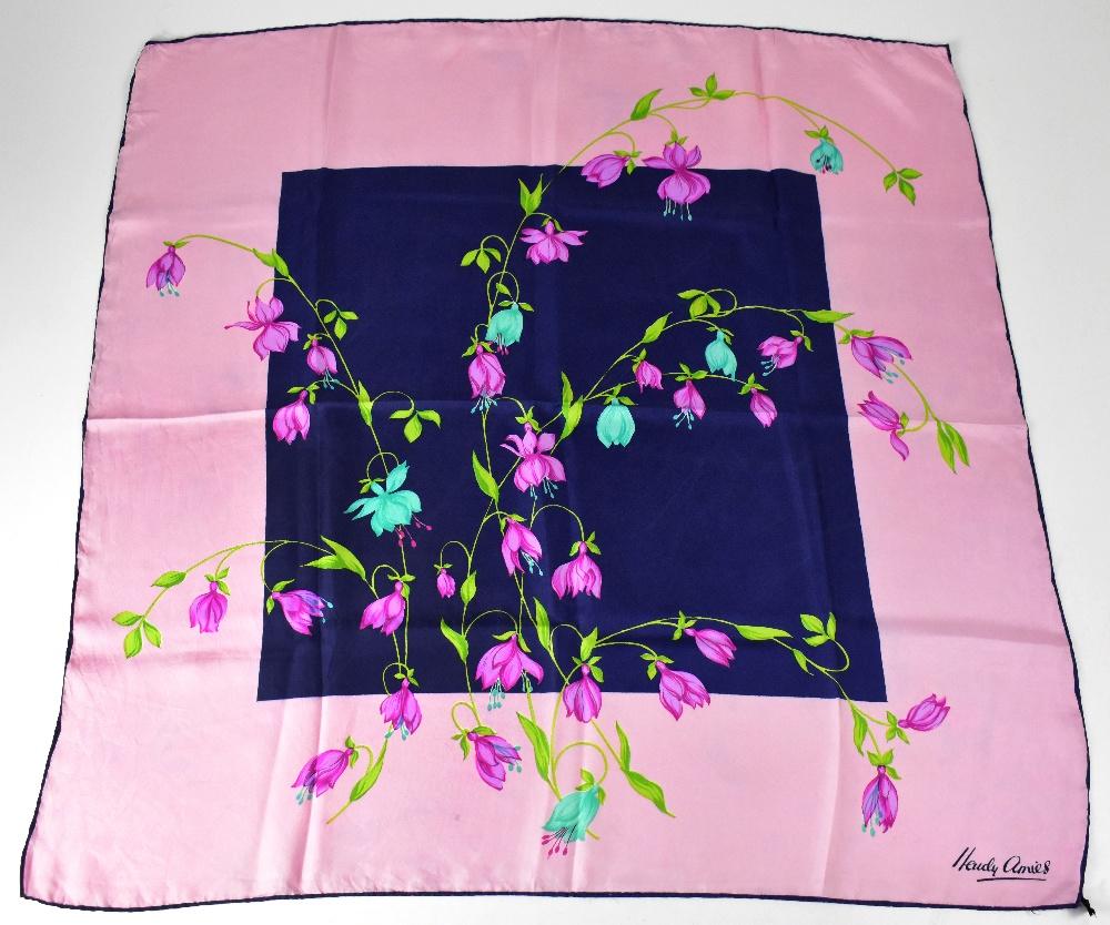 Lot 575 of 1095: HARDY AMIES (Fashion Designer to the Queen); two vintage circa 1950s silk scarves comprising a navy and pink example with central square panel and wide rose pink border edged in navy with all-over design of trailing fuchsias in cerise pink and turquoise, signed in border Hardy Amies, 78 x 74cm and a cream silk scarf with falling autumn leaves, signed in the corner Hardy Amies, 78 x 74cm (2).