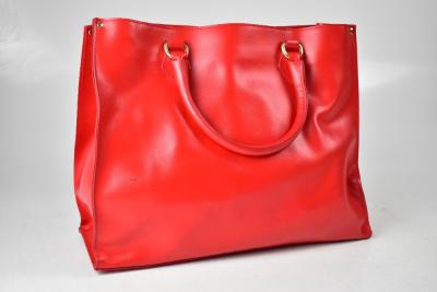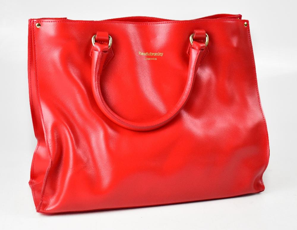 Lot 578 of 1095: RUSSELL & BROMLEY, LONDON; a vibrant red leather tote bag with Russell & Bromley London gilded letters to the front, with dust cover.