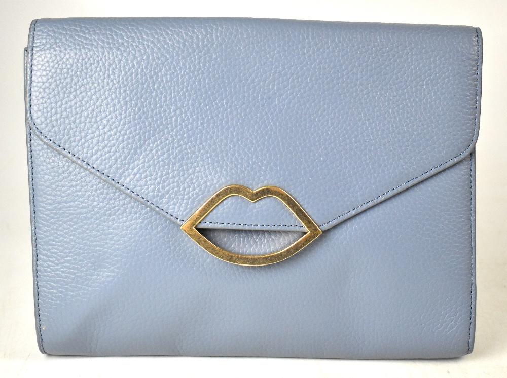 Lot 581 of 1095: LULU GUINNESS; a grained leather clutch bag, 'Leila', style no.50119936, colour 'Mist' with yellow metal clasp in the form of a pair of lips, with original dust cover.