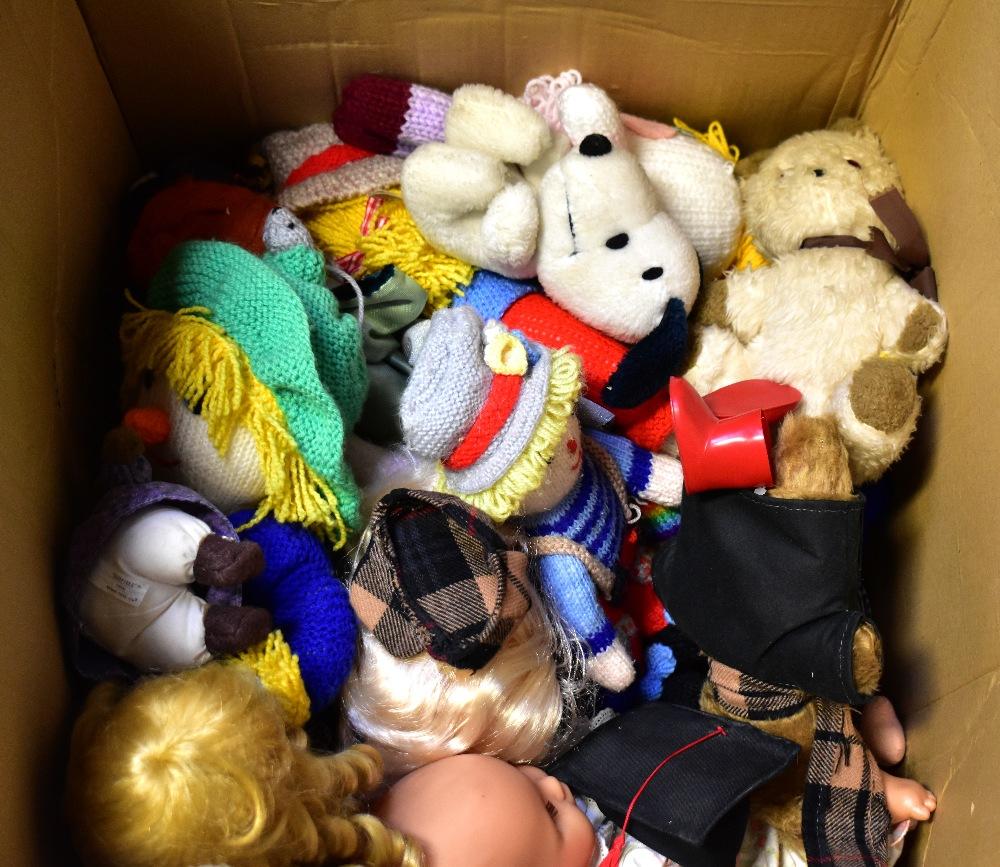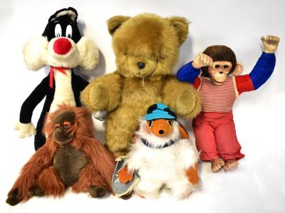 Lot 760 of 1095: A good quantity of mixed vintage and modern soft toys, dolls, etc, to include a large Sylvester the Cat, a celluloid chimpanzee in original clothes, various knitted dolls, collectors' dolls, Ratatouille, Womble, etc.