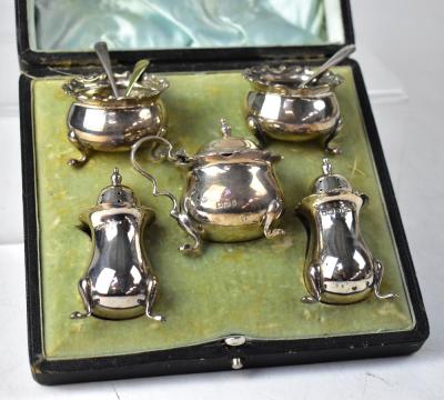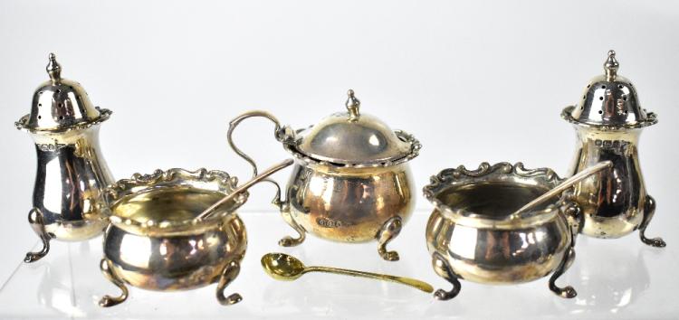 Lot 781 of 1095: A cased George V hallmarked silver cruet set of squat form with piecrust Rococo-style scroll borders, comprising a pepper pot, pair of salts, pair of mustards and one matching spoon, Walker & Hall, Sheffield 1910, with one other silver spoon and a plated example, combined weighable approx 5.1ozt.