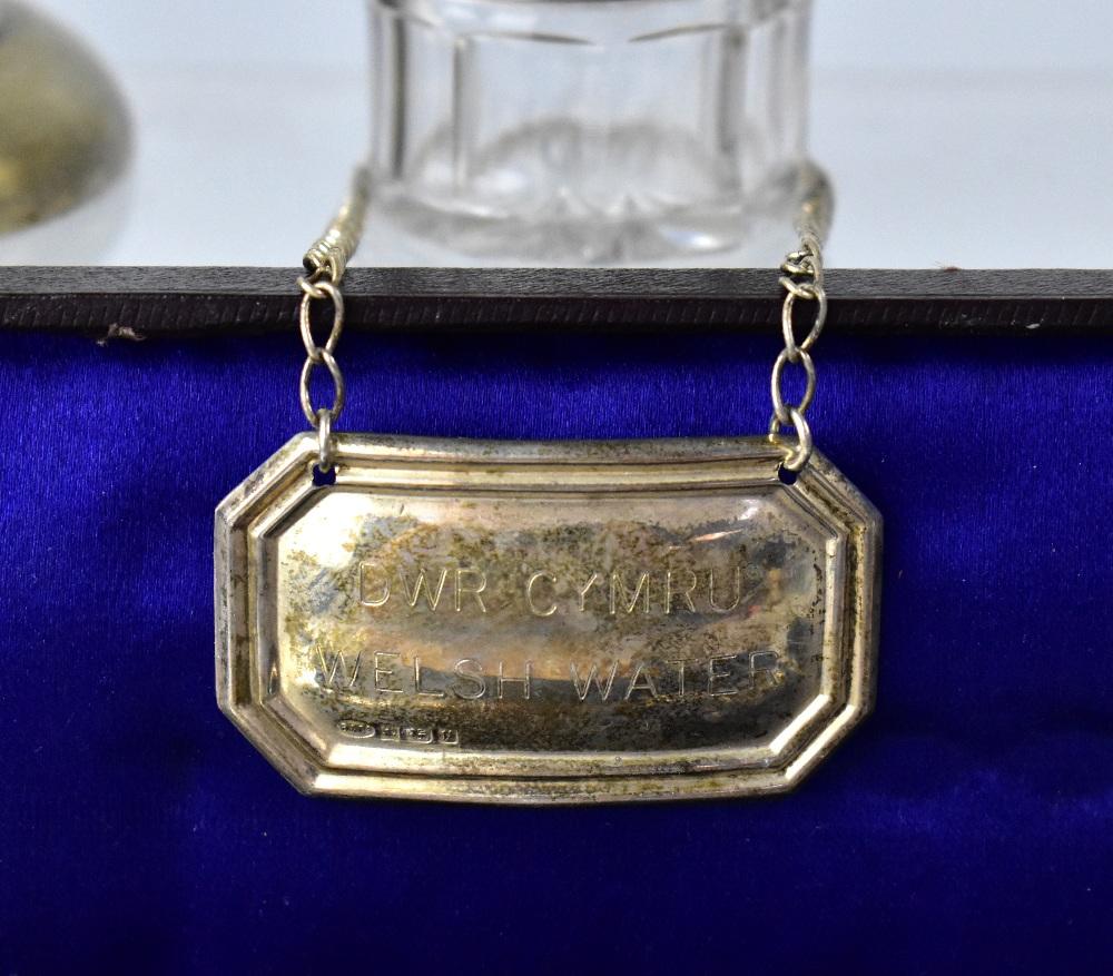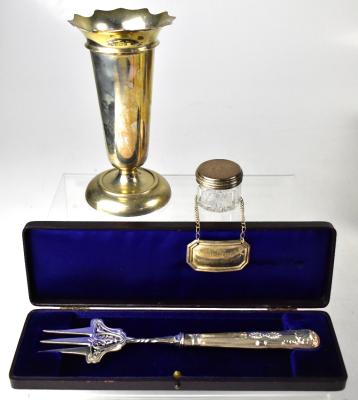 Lot 782 of 1095: A collection of hallmarked silver items comprising a trumpet vase, a silver topped dressing table jar, a bottle label marked 'Dwr Cymru Welsh Water', and a boxed toasting fork, various marks (4).