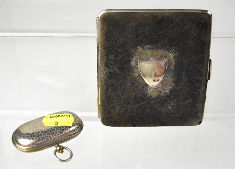 Lot 786 of 1095: A gentlemen's hallmarked silver and leather wallet, the front with blank silver shield, silver edging and clasp, leather interior with note sheet and pencil, and a silver plated sovereign and half sovereign holder, with mottled effect (2).