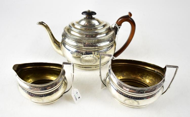 Lot 787 of 1095: A George III hallmarked silver three-piece tea service, comprising teapot, height 17.5cm, sucrier and milk jug, with chased bead and foliate design, each with cartouche of laurel leaves with monogram, George Burrows, London 1801, combined approx 28ozt (3).