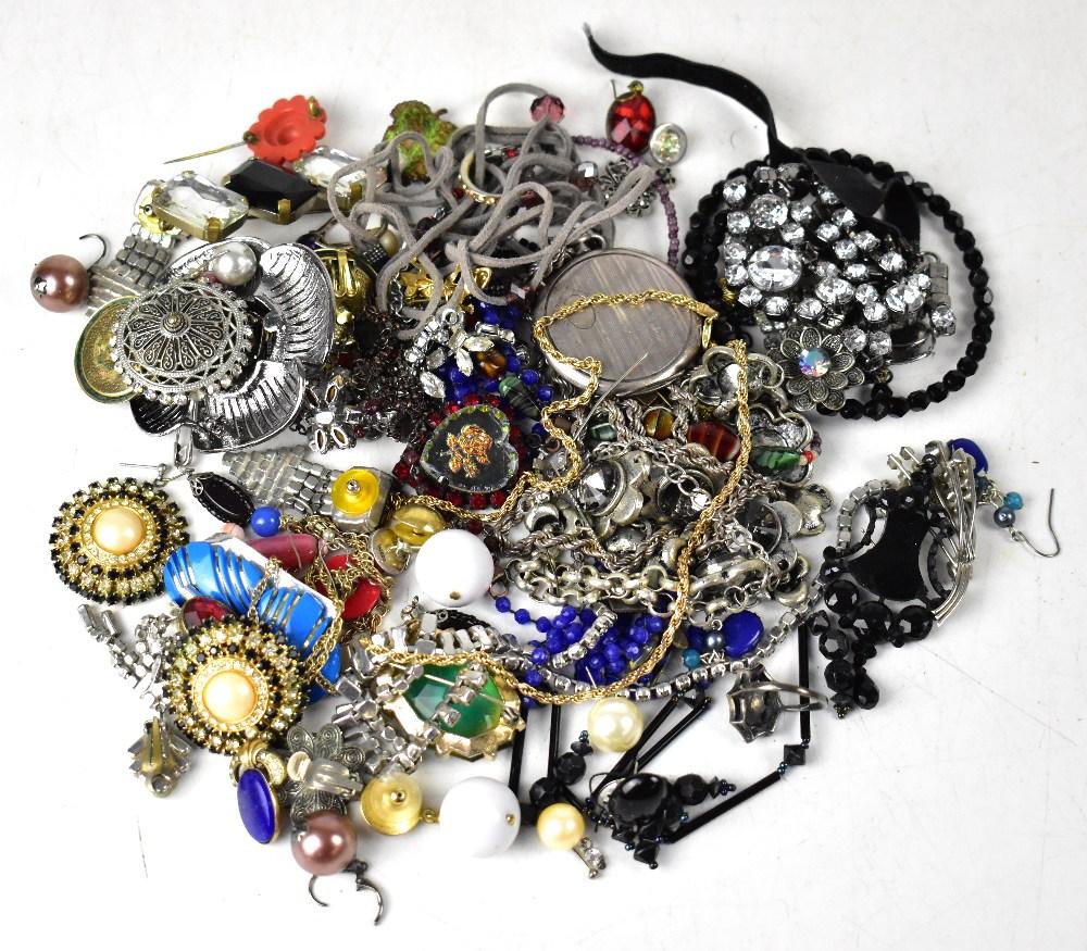 Lot 1002 of 1095: A 9ct gold necklace with lobster claw clasp (af), and various items of costume jewellery to include earrings, brooches, pendants, ring, silver chain, etc.