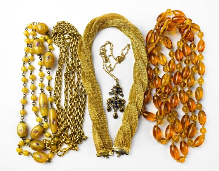 Lot 1006 of 1095: An Italian glass beaded necklace with cased gold foil, a honey amber-style necklace, a gold plated woven mesh necklace, a gold plated muff chain with swivel clasp and a blue stone pendant suspended on a 9ct gold dainty chain.