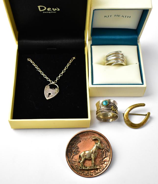 Lot 1013 of 1095: Various items of costume jewellery to include a silver mid-20th century wide band ring, with turquoise stone, size P, a modern Kit Heath silver multi-twist ring, size U, in Kit Heath presentation box, a lucky horseshoe brooch, a silver necklace and heart clasp pendant and a copper circular brooch depicting mountain goat in mountain scene (5).