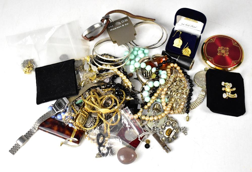Lot 1024 of 1095: Various items of costume jewellery to include fashion watches, necklaces, silver gate bracelet, lighters, cigar cutter, coin bracelet, compact, etc.