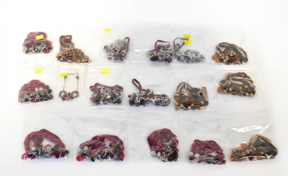 Lot 1026 of 1095: A quantity of various items of costume jewellery, ex retail stock to include necklaces, bracelets, some with ribbon and suede thongs suspending various coloured breads and white metal pendants (3).
