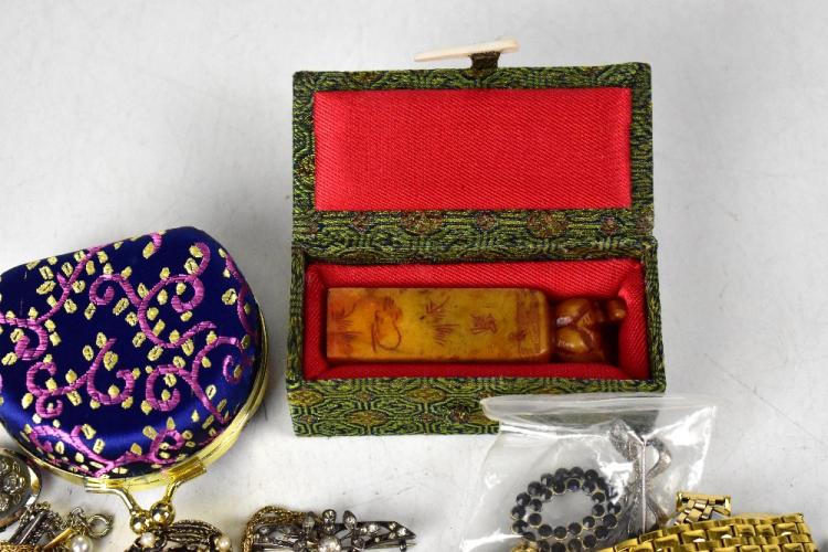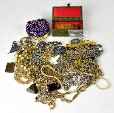Lot 1027 of 1095: A quantity of mainly contemporary costume jewellery to include various yellow and white metal chains, one marked 'Christian Dior Germany', white metal and marcasite brooches, one in the form of a sailing ship, two ladies' wristwatches, one with rolled gold bracelet strap, a small blue satin jewellery box and a green Oriental box containing a small soapstone seal, etc.