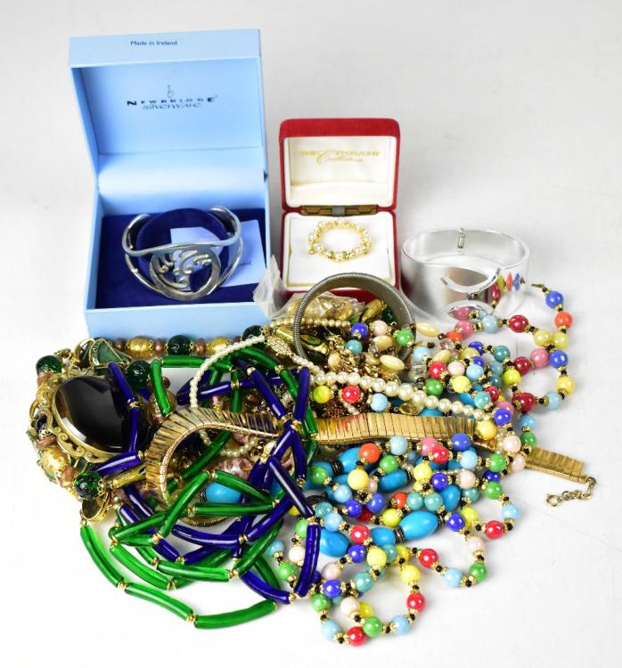 Lot 1030 of 1095: Various items of vintage and modern costume jewellery to include an Irish made Newbridge silver bangle, brooches, bracelets, necklaces, gold plated necklace chains, etc.