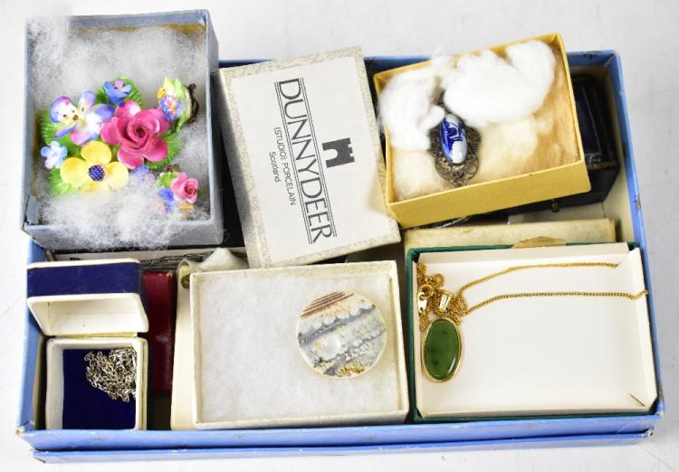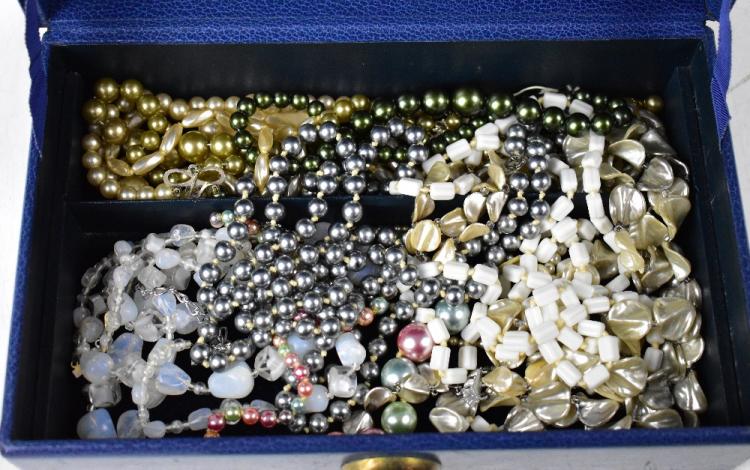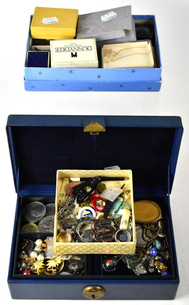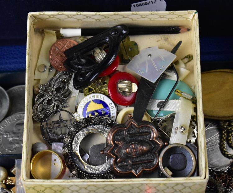 Lot 1032 of 1095: A vintage blue leather jewellery box containing a quantity of mainly vintage costume jewellery to include brooches, earrings, chains, bead necklaces, clip-on earrings etc, and a quantity of British silver coinage to include Churchill crowns, 50p pieces and a 1986 £2 coin, various belt buckles, brooches, some contained in original boxes, etc (2).
