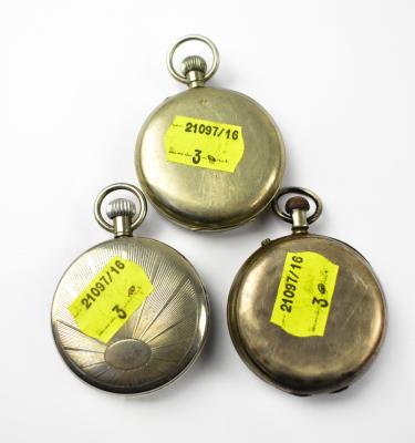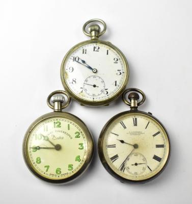 Lot 1038 of 1095: THOMAS RUSSELL & SON LIVERPOOL; a hallmarked silver open face crown wind pocket watch, the white enamelled dial set with Roman numerals and smaller subsidiary seconds dial, numbered 47861, a silver plated open face crown wind pocket watch, the white dial set with Arabic numerals and smaller subsidiary dial, and a vintage silver plated 'Railway Timekeeper, Duke' open face crown wind pocket watch, the off-white circular dial set with luminous Arabic numerals (3).