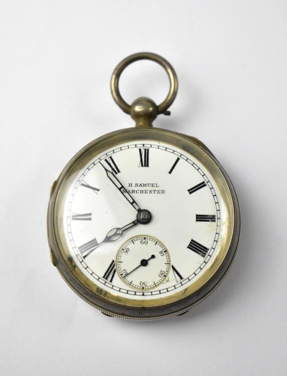 Lot 1039 of 1095: A Victorian hallmarked silver crown wind open face pocket watch, the enamelled dial set with Roman numerals and secondary dial maker H Samuel, Manchester, no. 293418, inner lid with maker's mark, Chester 1897, dial diameter 4.5cm, approx 3.8ozt.