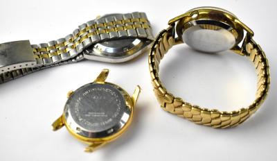 Lot 1059 of 1095: SEIKO; a No5 Automatic gentlemen's wristwatch, the gold-coloured dial set with raised baton increments and day/date calendar window at 3 o'clock, on two-tone bracelet strap, a Seiko Automatic Diashock seventeen jewel wristwatch, the silvered dial set with gold-coloured baton markers, date window at 3 o'clock, on a gold plated flexi strap and a Relide Automatic twenty-five jewel gentlemen's watch head (3).