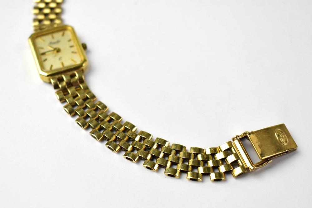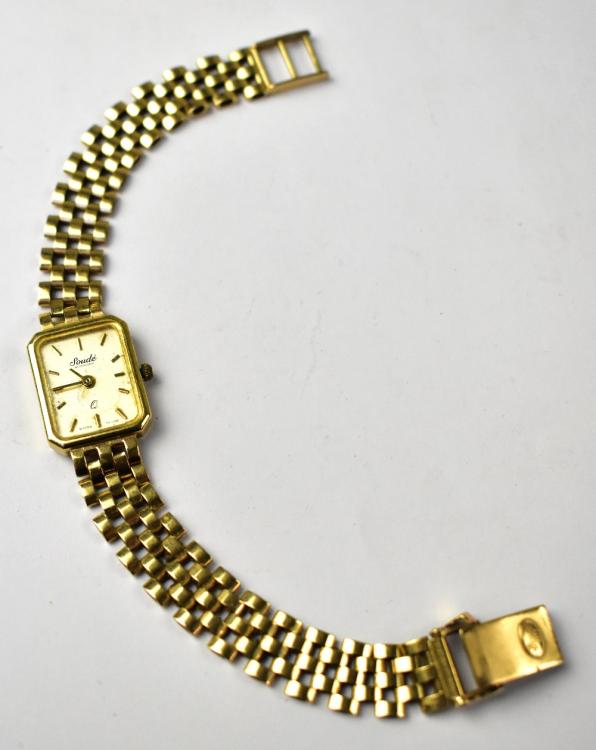 Lot 1060 of 1095: SOUDE INTERNATIONAL; a ladies' vintage 9ct gold wristwatch, the square silvered dial set with raised baton numerals, crown wind movement, on 9ct gold bracelet strap, total weight approx 18.7g.