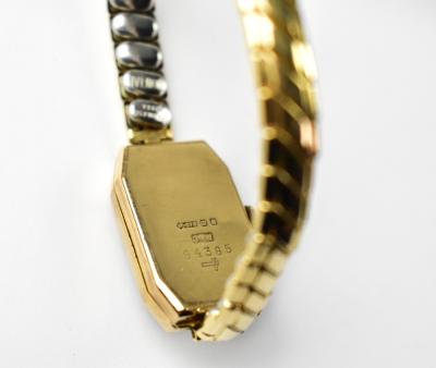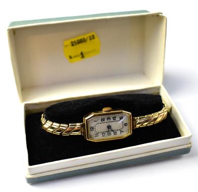 Lot 1063 of 1095: A ladies' vintage 9ct gold tank-style crown wind wristwatch, the lozenge-shaped dial set with Arabic numerals, stamped 9ct gold to the case, on a gold plated flexi strap, in presentation box.