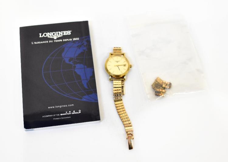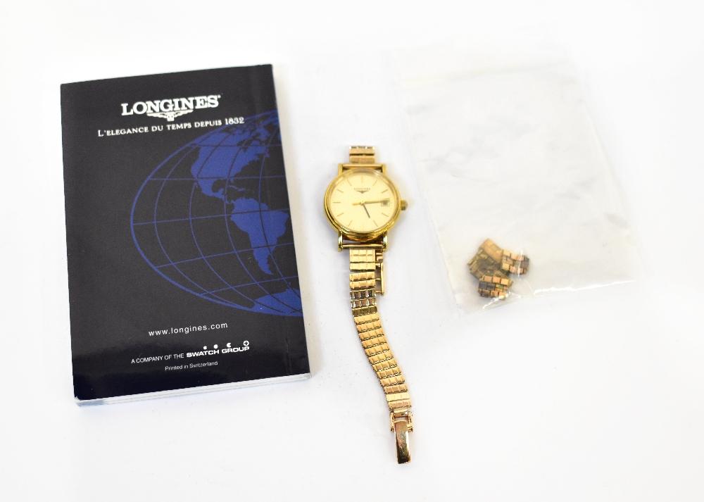 Lot 1064 of 1095: LONGINES; a ladies' yellow metal watch, the gilded dial set with baton numerals and date aperture, on a 9ct yellow gold brick link bracelet strap, with original International Guarantee card and booklet.