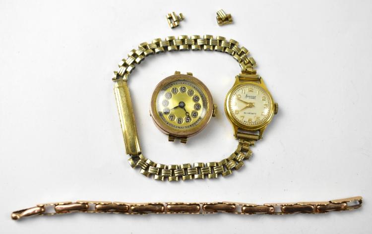 Lot 1066 of 1095: A vintage 9ct rose gold ladies' wristwatch, the gilded dial set with Arabic numerals and a matching 9ct rose gold bracelet strap (af), and an Accurist ladies' yellow metal wristwatch, the silvered dial set with Arabic numerals, on link bracelet strap (2).