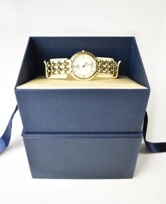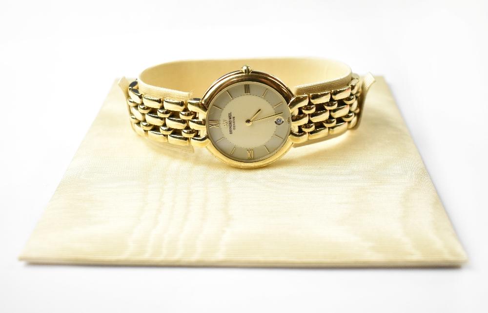 Lot 1068 of 1095: RAYMOND WEIL; a ladies' gold plated wristwatch, model no.9138 A320531, the two-tone circular dial set with raised Roman numerals and a smaller calendar window at 6 o'clock, on gold plated bracelet watch, with Certificate of Guarantee, stating it was purchased in 1997 from Ernest Jones, Preston, International Guarantee, Care Booklet, in presentation box.