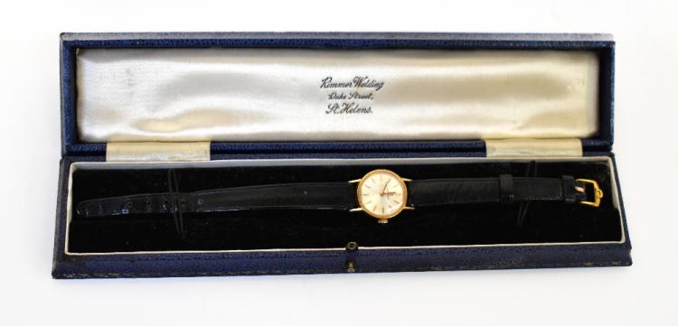 Lot 1069 of 1095: OMEGA; a yellow metal ladies' circular wristwatch, the silvered dial set with gold-coloured baton numerals, on black leather strap, diameter approx 2cm.