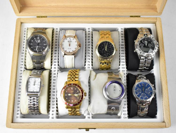 Lot 1074 of 1095: A wooden case containing eight dress watches, to include Casio, Citron Quartz, two Sekonda examples, Storm, etc (8).