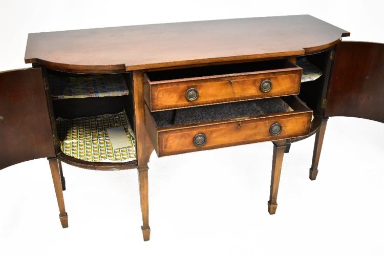 Lot 43 of 1061: A reproduction mahogany bow-front sideboard, with pair of doors above arched alcove, flanked by pair of bowed panelled doors, raised on square tapering supports to spade feet, 91.5 x 153 x 59.5cm.