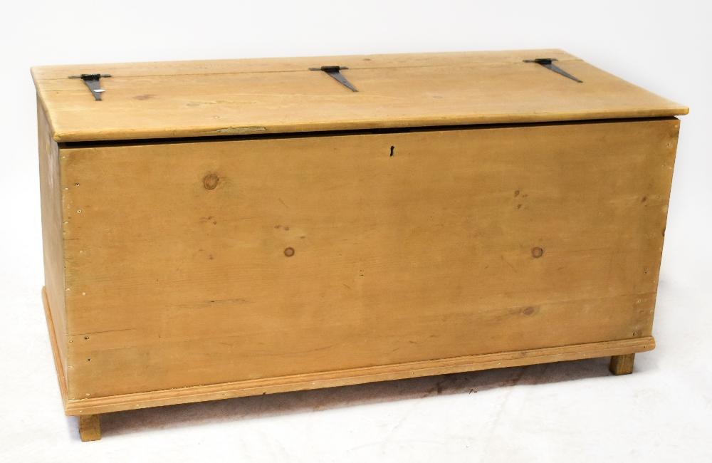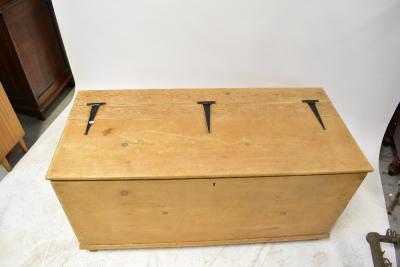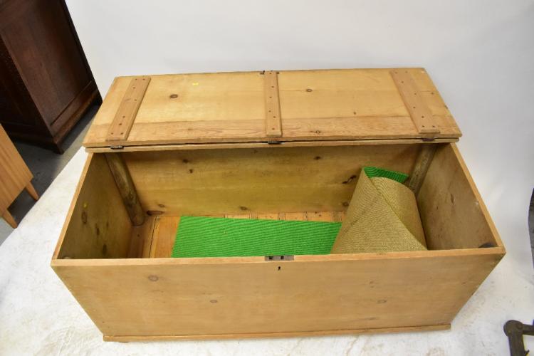 Lot 49 of 1061: A very large, possibly bespoke made pine bedding box, the pine top with iron external hinges, on square stile supports, 73 x 150 x 66cm.