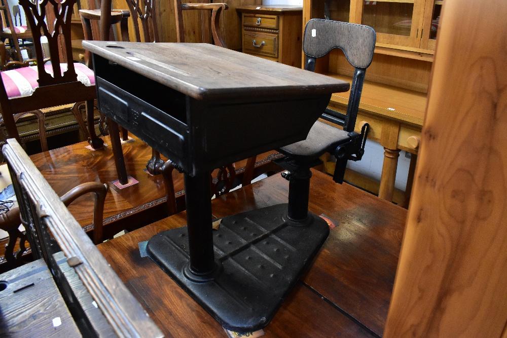 Lot 50 of 1061: A vintage cast iron and wooden school desk with rotating lift-up seat, 72 x 61cm.