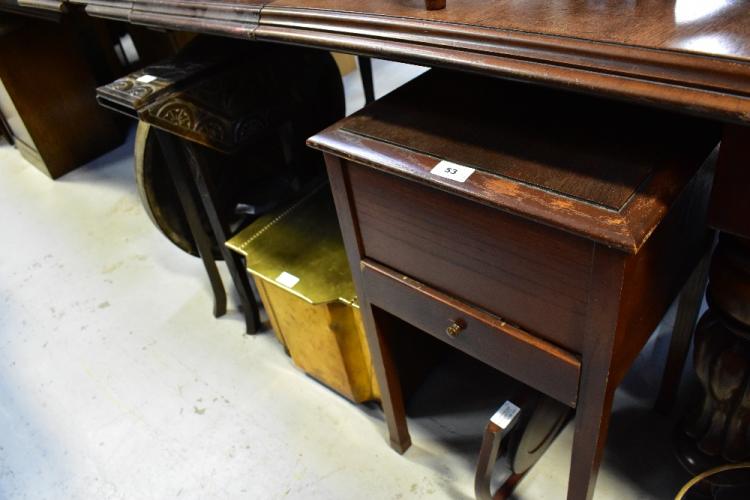 Lot 53 of 1061: Various items of small furniture to include a sewing table and contents, a brass standard lamp raised on three splayed feet, a folding three-tier plate rack, a brass coal bucket, a folding table, a Middle Eastern brass charger and a Middle Eastern brass topped table stop (lacking stand) (7).