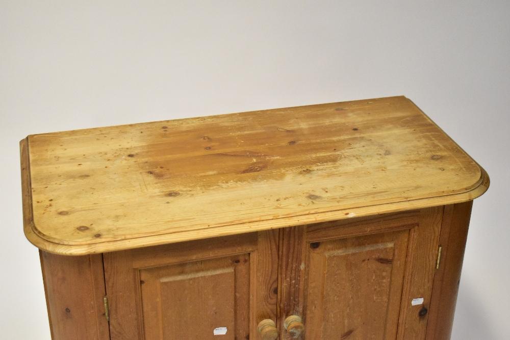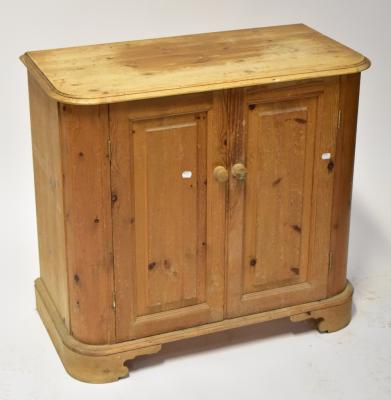 Lot 55 of 1061: A pine bow fronted cupboard with a paid of panelled doors on plinth base, 84 x 90 x 45cm.