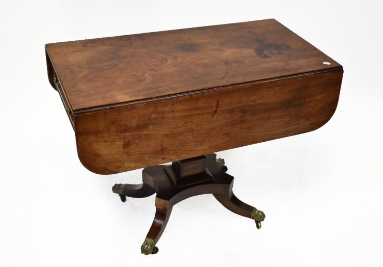 Lot 58A of 1061: A Regency mahogany Pembroke table with D-end leaves above a single frieze drawer, on a square tapered column and a quadripartite base with outswept legs terminating in brass lion paw feet and castors, height 72cm, length 92cm.