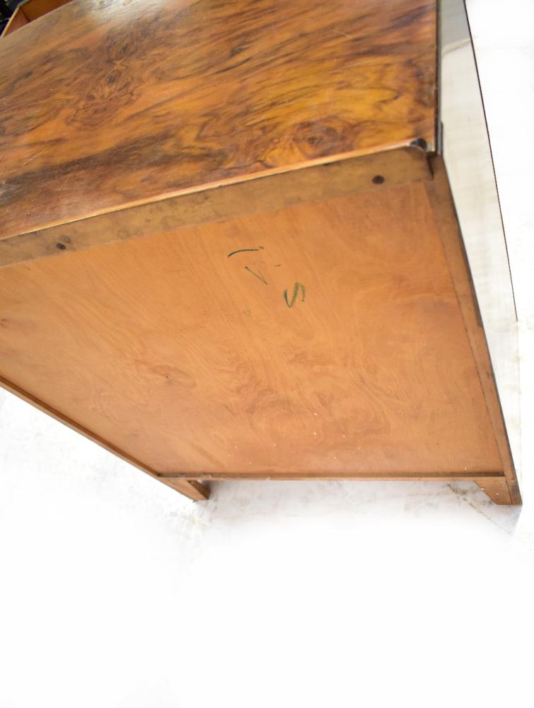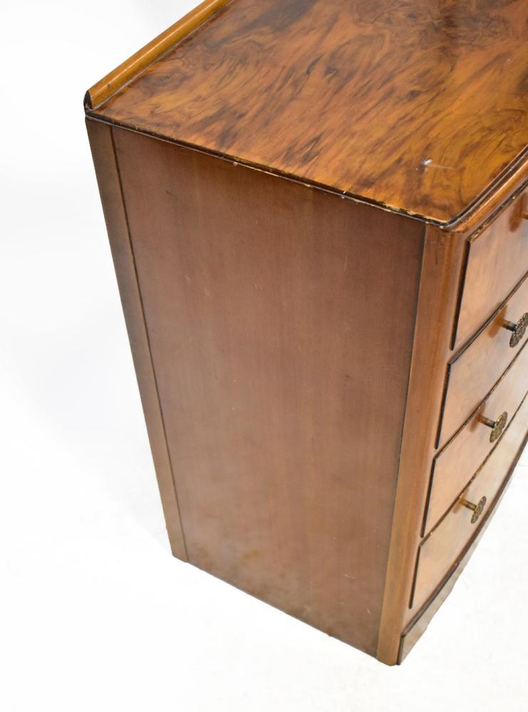 Lot 59 of 1061: A 1940s walnut veneered bow-fronted chest of four drawers, raised on simple bracket feet, 95 x 76 x 50cm (af).