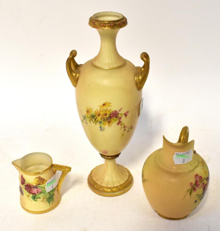 Lot 275 of 1061: ROYAL WORCESTER; a blush ware twin-handled vase with a slender neck and ovoid body, raised on a circular foot painted with floral sprigs with gilt highlighting, green mark dated 1900 and numbered 2049, height 23.5cm, together with another similar Royal Worcester blush ware jug, puce mark dated 1903, numbered 1094, height 12cm and a similar small sparrow beak jug, green mark dated 1900, height 6.5cm (af) (3).