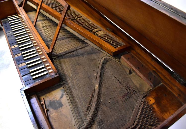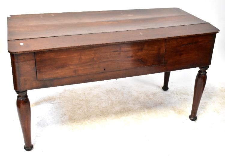 Lot 16 of 1493: An early 19th century mahogany cased square top piano with wooden frame, inverted key covers, raised on turned supports, 79 x 141 x 63cm (af).