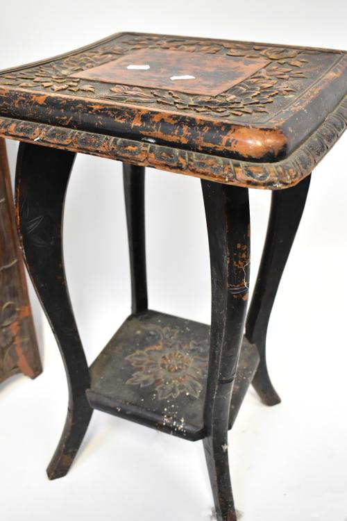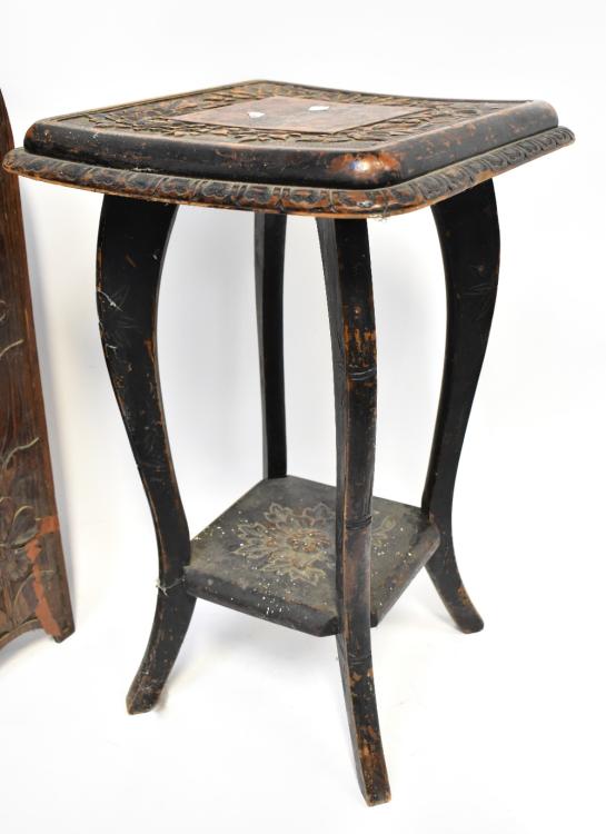 Lot 19 of 1493: An Arts and Crafts carved wooden four-leaf folding screen with tulip and flower head decoration, height 73cm, together with a mid-20th century stained wooden square topped occasional table, height 62cm (2).