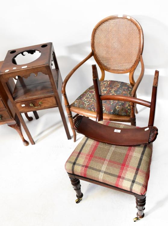 Lot 21 of 1493: A William IV mahogany bar back dining chair with overstuffed seat upholstered in tartan fabric, together with a Victorian walnut bergère backed carver dining chair with drop-in seat, on turned legs, a 19th century mahogany two-tier wash stand, square top with cut-outs for bowl, etc (af), height 80cm, and a reproduction walnut bow-front bedside cabinet of three drawers on cabriole legs, height 71cm (4).