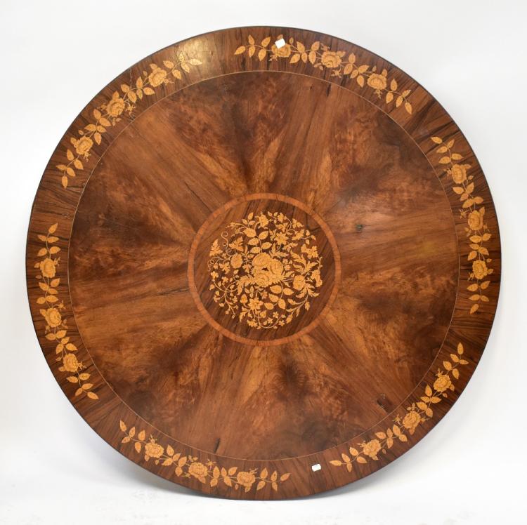 Lot 30 of 1493: A rosewood inlaid circular tilt-top breakfast table, raised on hexagonal baluster column to three outswept scrolling supports, 75 x 136.5cm.