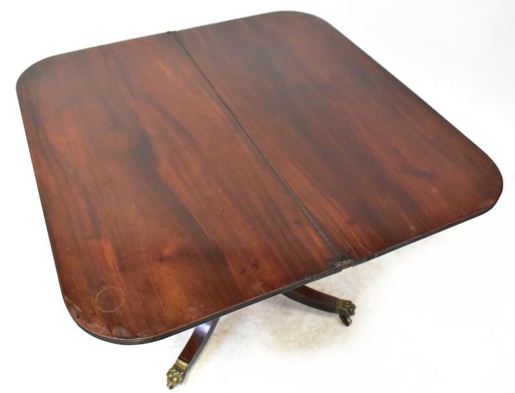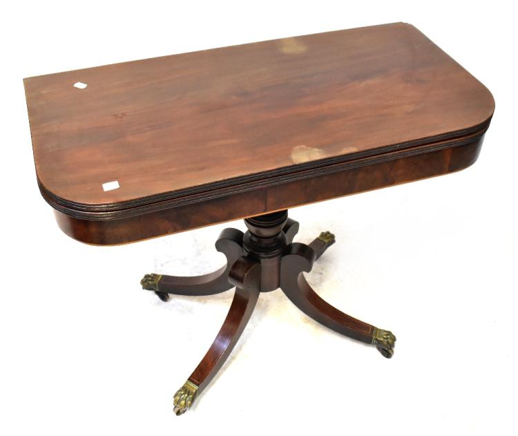 Lot 32 of 1493: A reproduction Regency-style mahogany fold-over tea table raised on baluster turned central columns and raised on outswept scrolling supports terminating in brass lion paw feet and castors, 72 x 90.5 x 45cm (af).