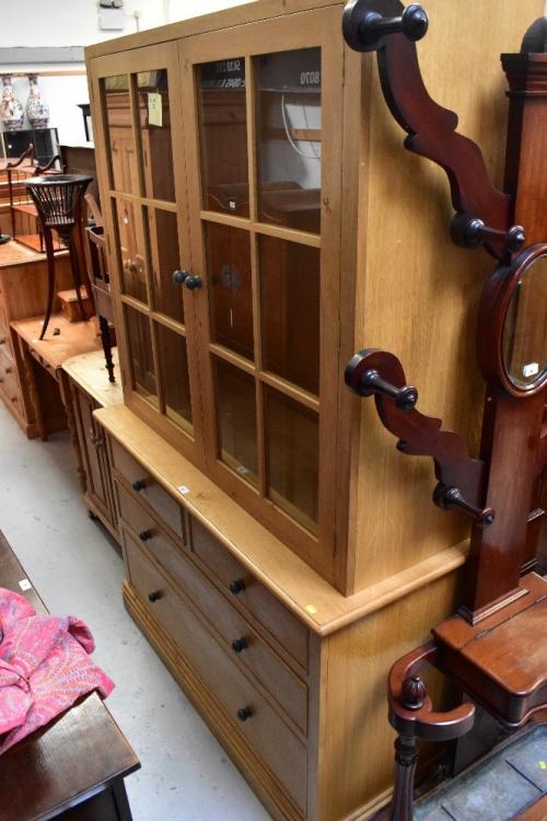 Lot 45 of 1493: A modern carpenter made clothes cabinet, with six glazed panels to the doors, hanging rails to the interior, turned handles, over an oak base with two small over two graduated drawers, 209 x 136 x 59cm.