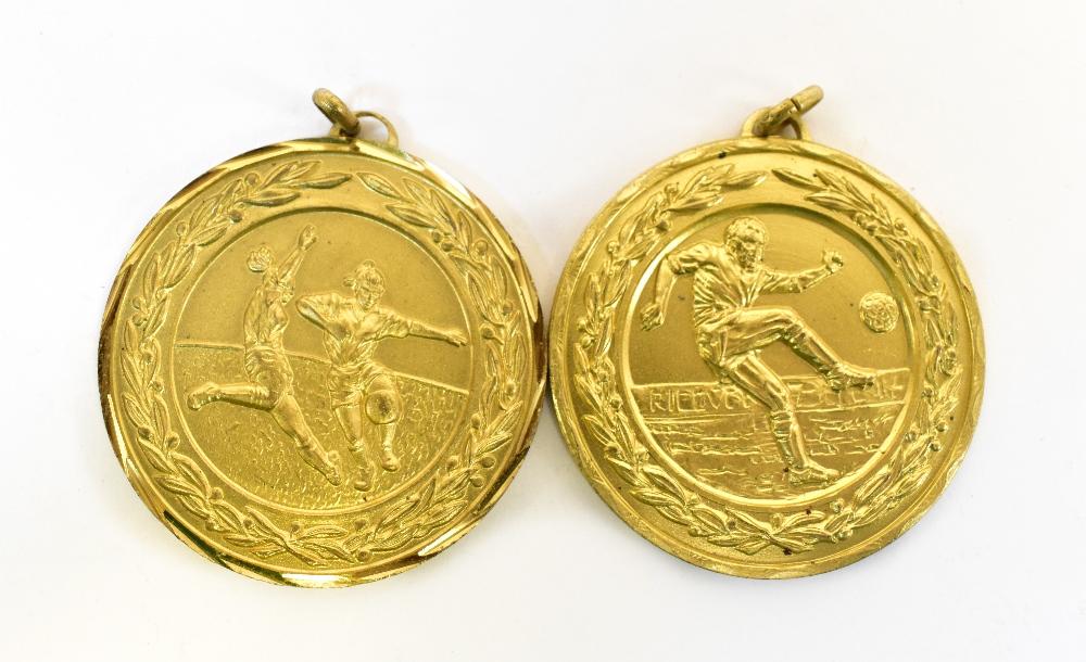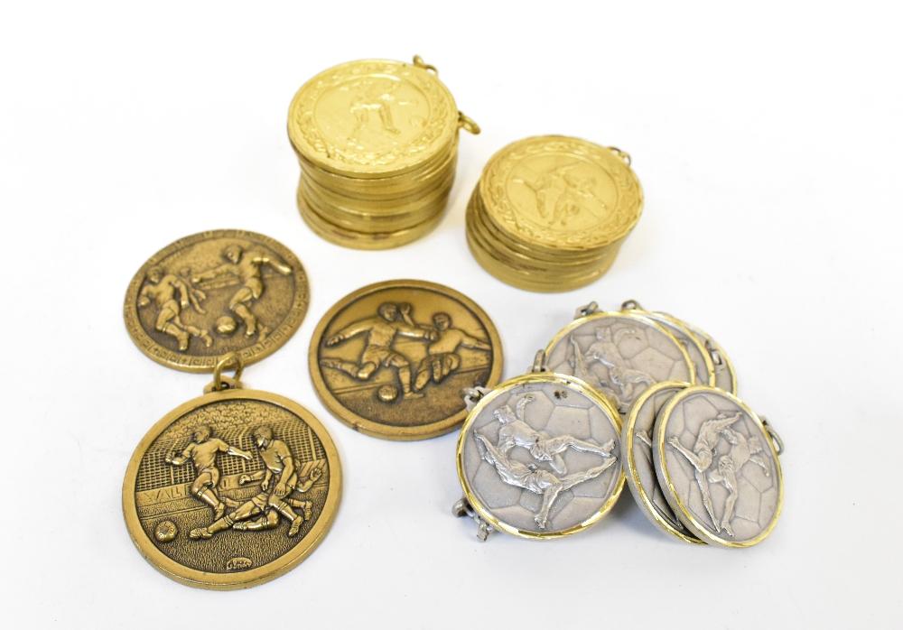 Lot 183 of 1493: A quantity of modern blank football prize medals, various sizes to include twenty gold-coloured examples, diameter 5cm, ten pewter-coloured examples with gold plated outer rim, diameter 4.2cm, three larger miscellaneous medals, diameter approx 5.6cm (33).