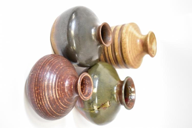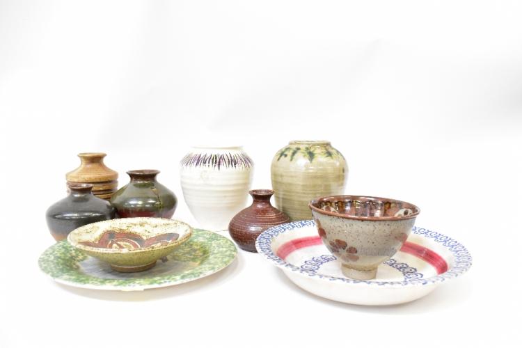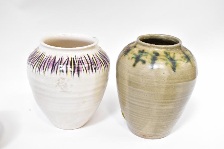 Lot 215 of 1493: WILL ILLSLEY (born 1948); a collection of studio pottery vessels, bowls and vases, to include a short cylindrical vase with turned ring sides, up to tapered flared neck, impressed with potter's mark, initials 'CSA' and date 1978, height 13cm, a baluster form vase with a light green glaze and glazed decorated floral border, impressed factory mark dated 1966 and name 'Morris', height 16cm, a squat form vase in the raku manner, height 10cm, impressed date of '72, a squat form vase with a brown fade